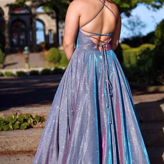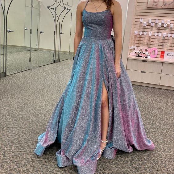 Sparkly Scoop Neck Blue Long Prom Evening Dresses with SIde Split