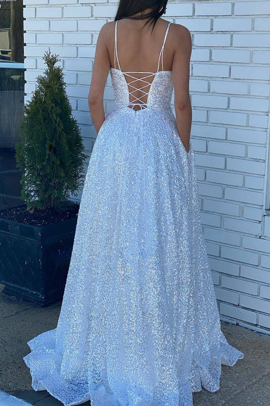 A-Line Scoop Neck Cross Back White Sequin Prom Dresses with Pockets