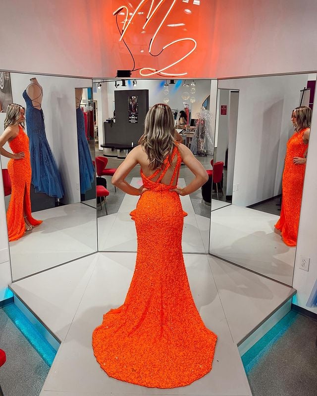 Sparkly Mermaid Orange Sequins Long Prom Dress with Slit