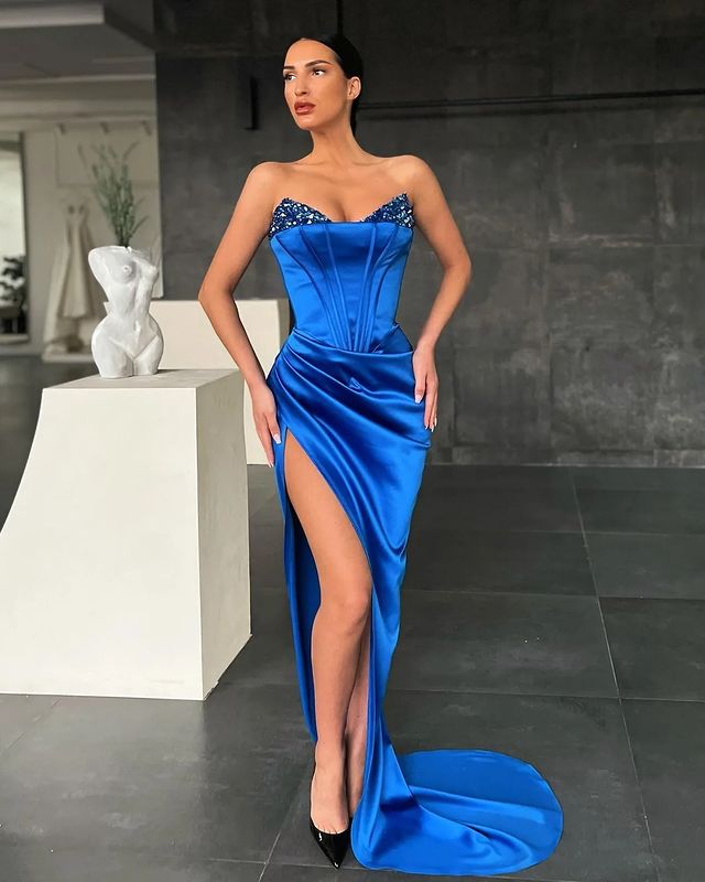 Stunning Mermaid V Neck Royal Blue Satin Long Prom Dresses with Slit