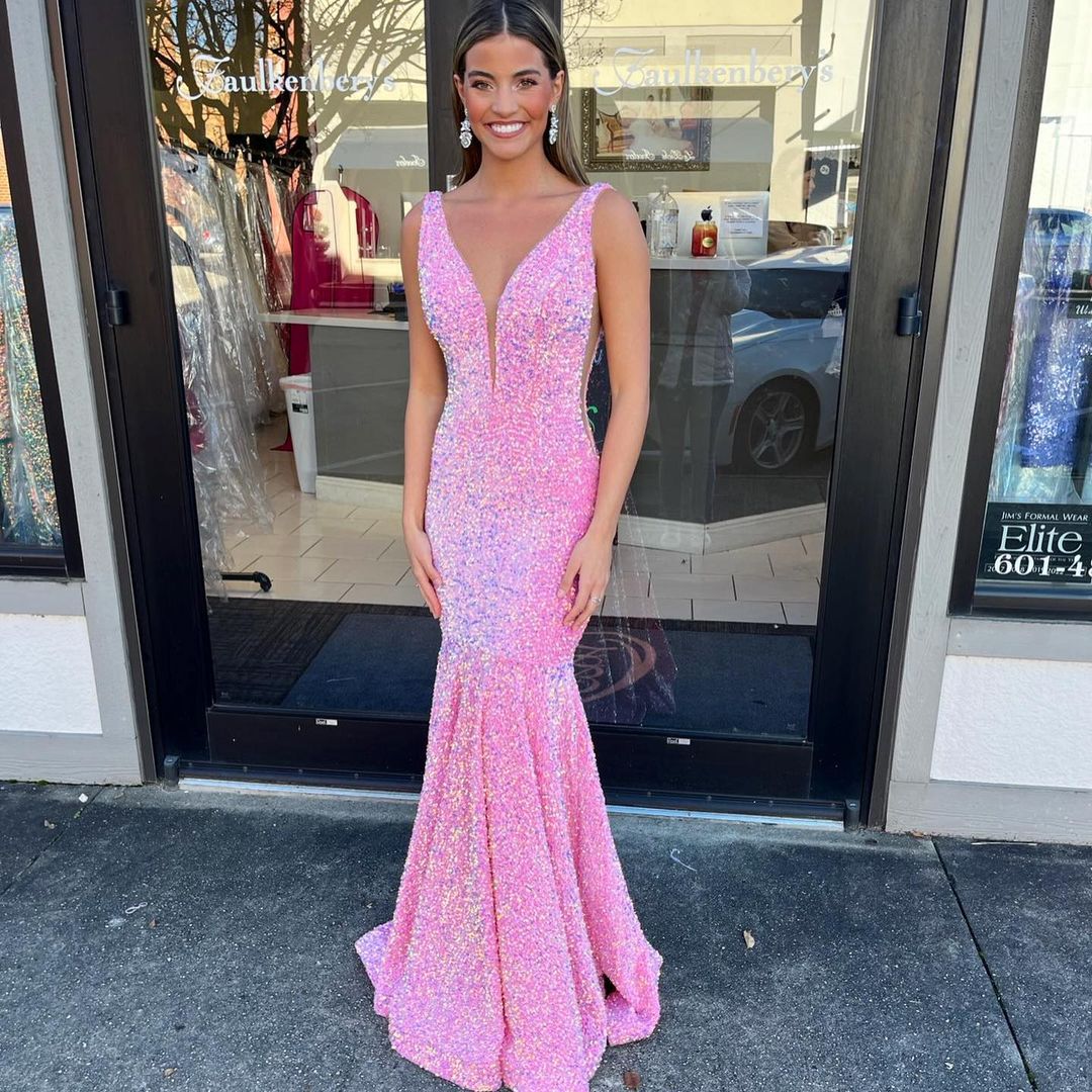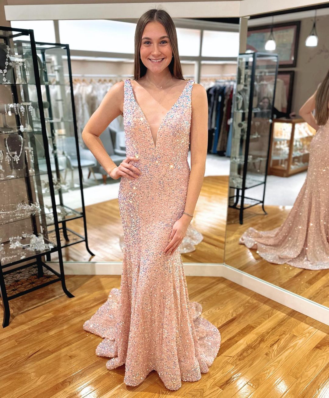 Cute Mermaid Deep V Neck Light Blue Sequins Prom Dresses