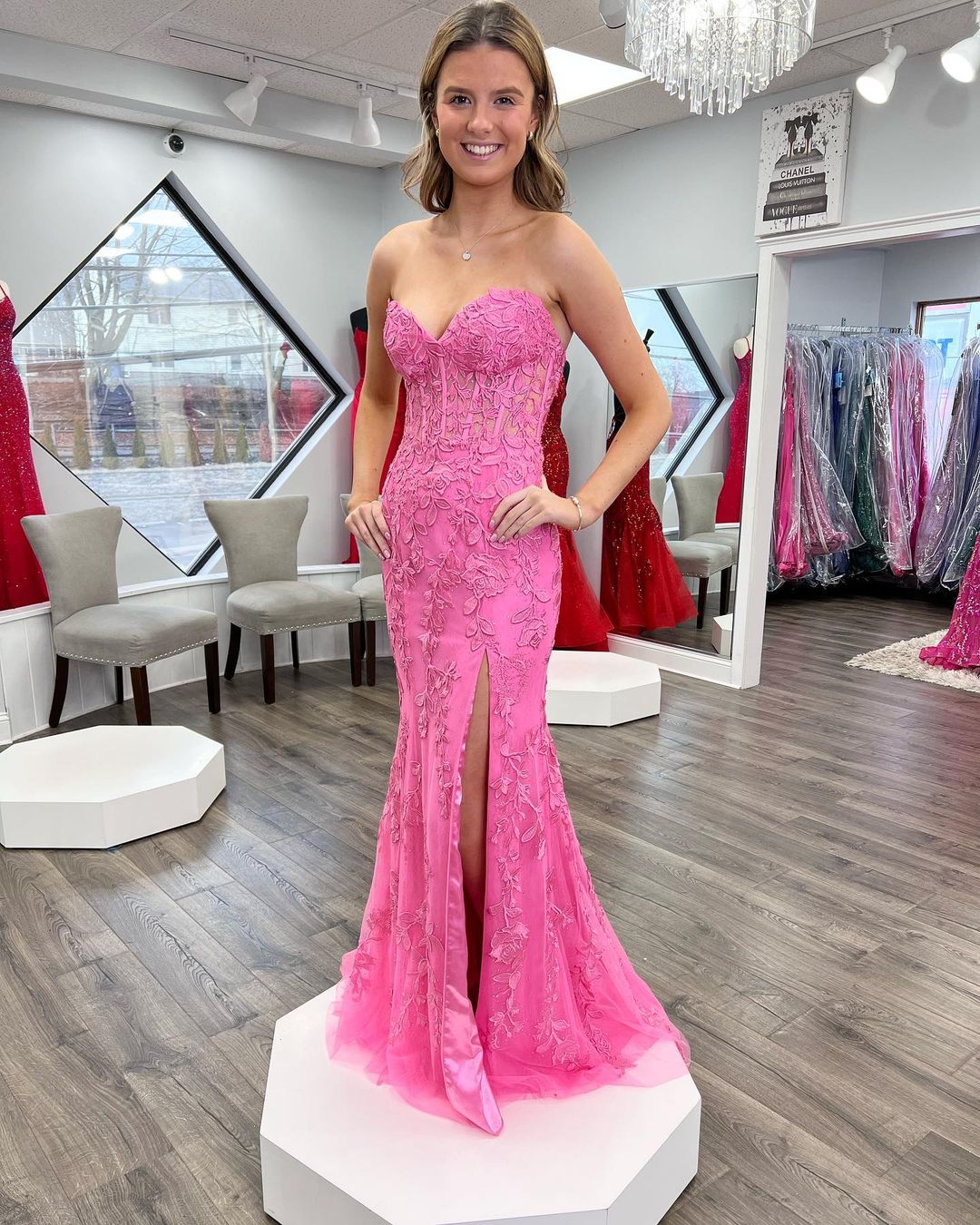 Cute Mermaid Sweetheart Hot Pink Lace Prom Dresses with Appliques