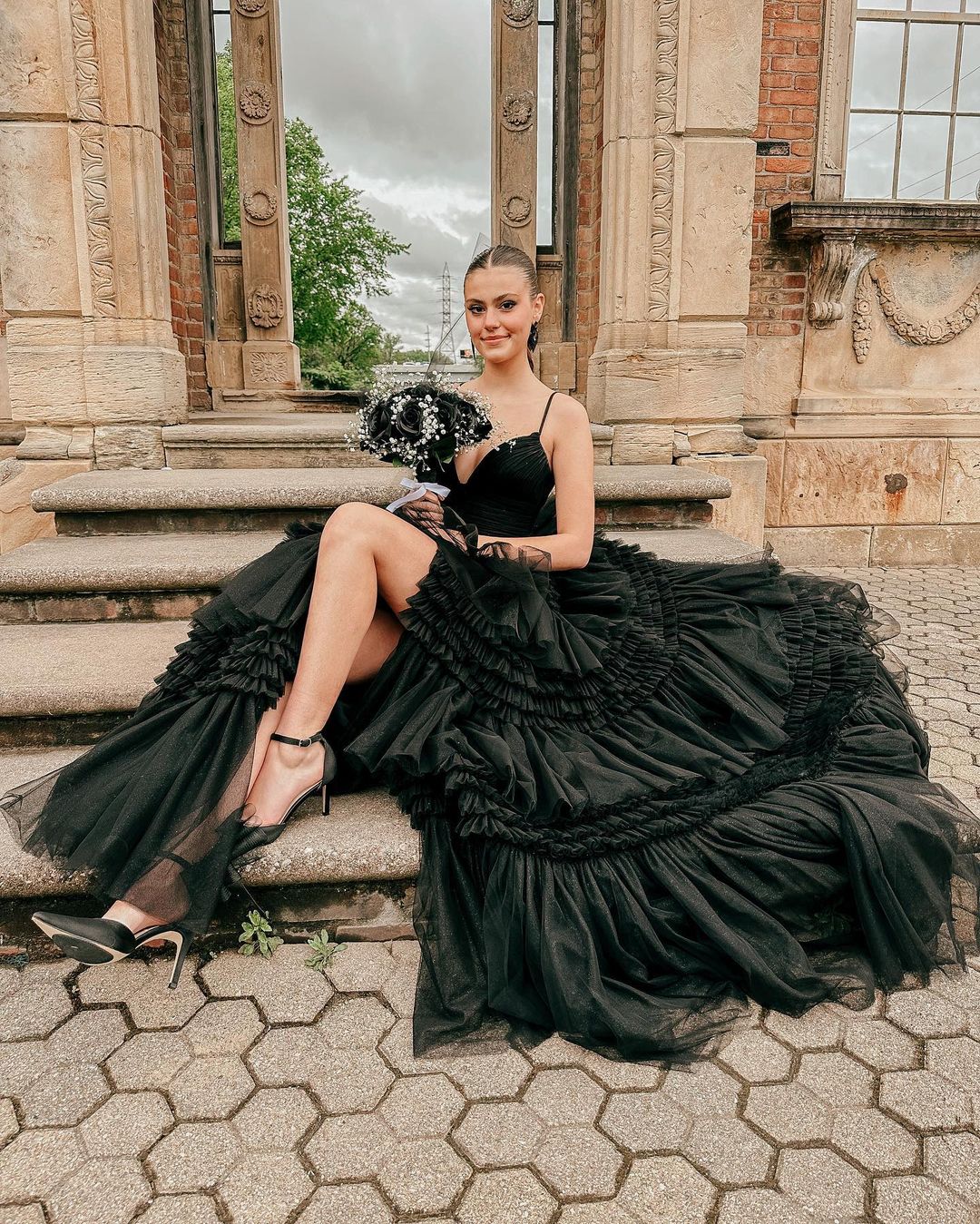 Cute A Line Tulle V Neck Black Tulle Prom Dresses with Slit