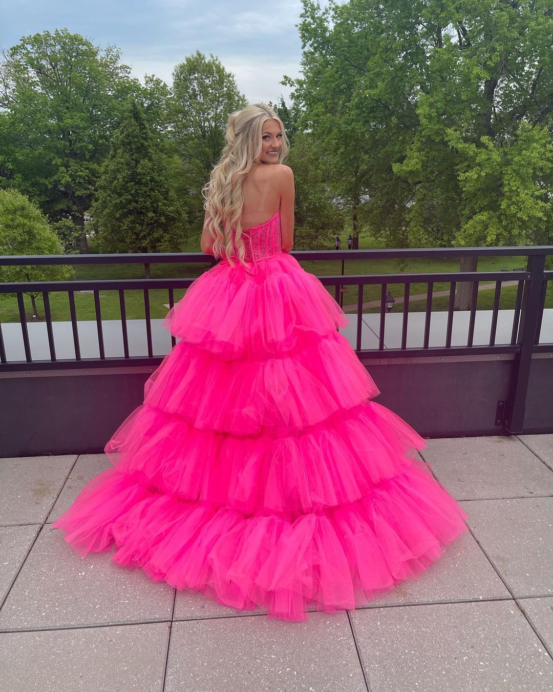 Cute A Line V Neck Hot Pink Tulle High Low Long Prom Dresses