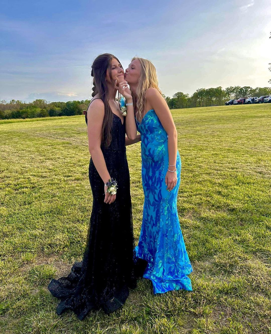 Cute Mermaid V Neck Blue Sequins Long Prom Dresses