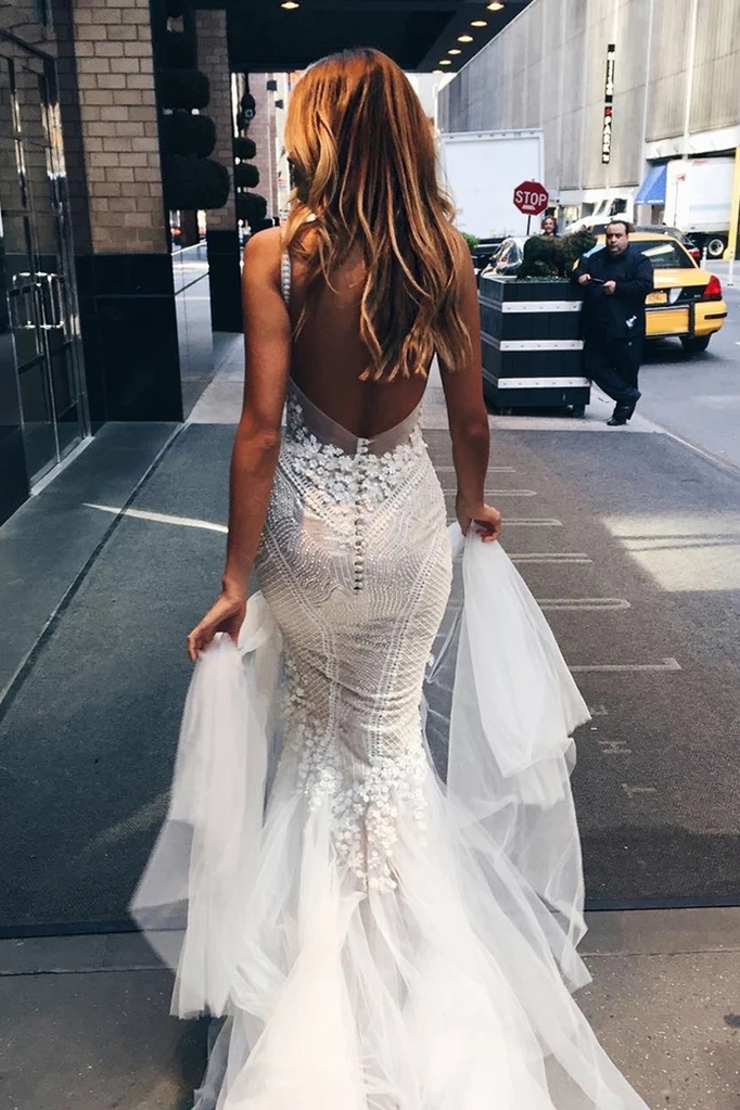 Luxurious Ivory Straps Mermaid Sleeveless Long Deep V-neck Tulle Wedding Dress with Lace