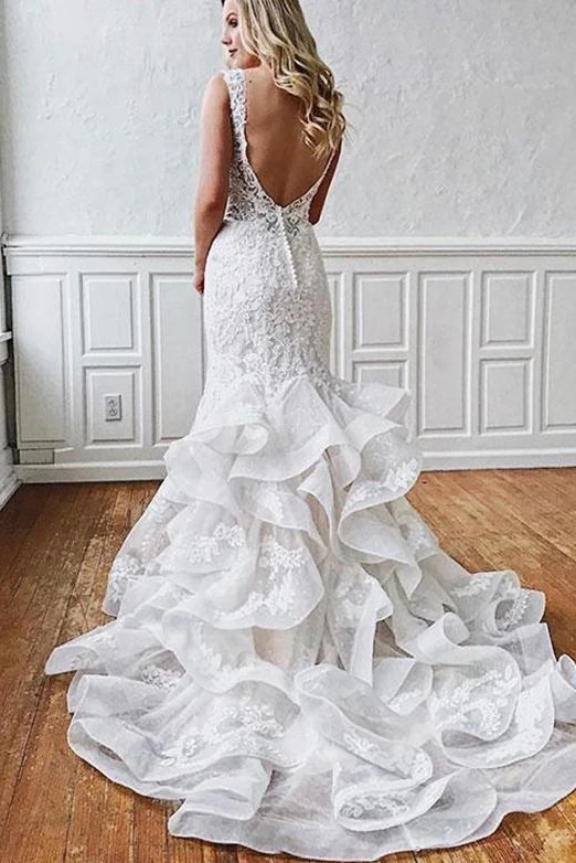 Gorgeous Mermaid V Neck White Sleeveless Tulle Wedding Dresses with Appliques