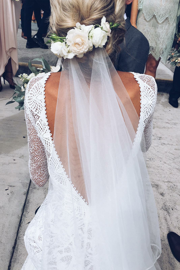 Sheath V Neck Long Sleeves White Lace Boho Wedding Dresses,Beach Wedding Dresses