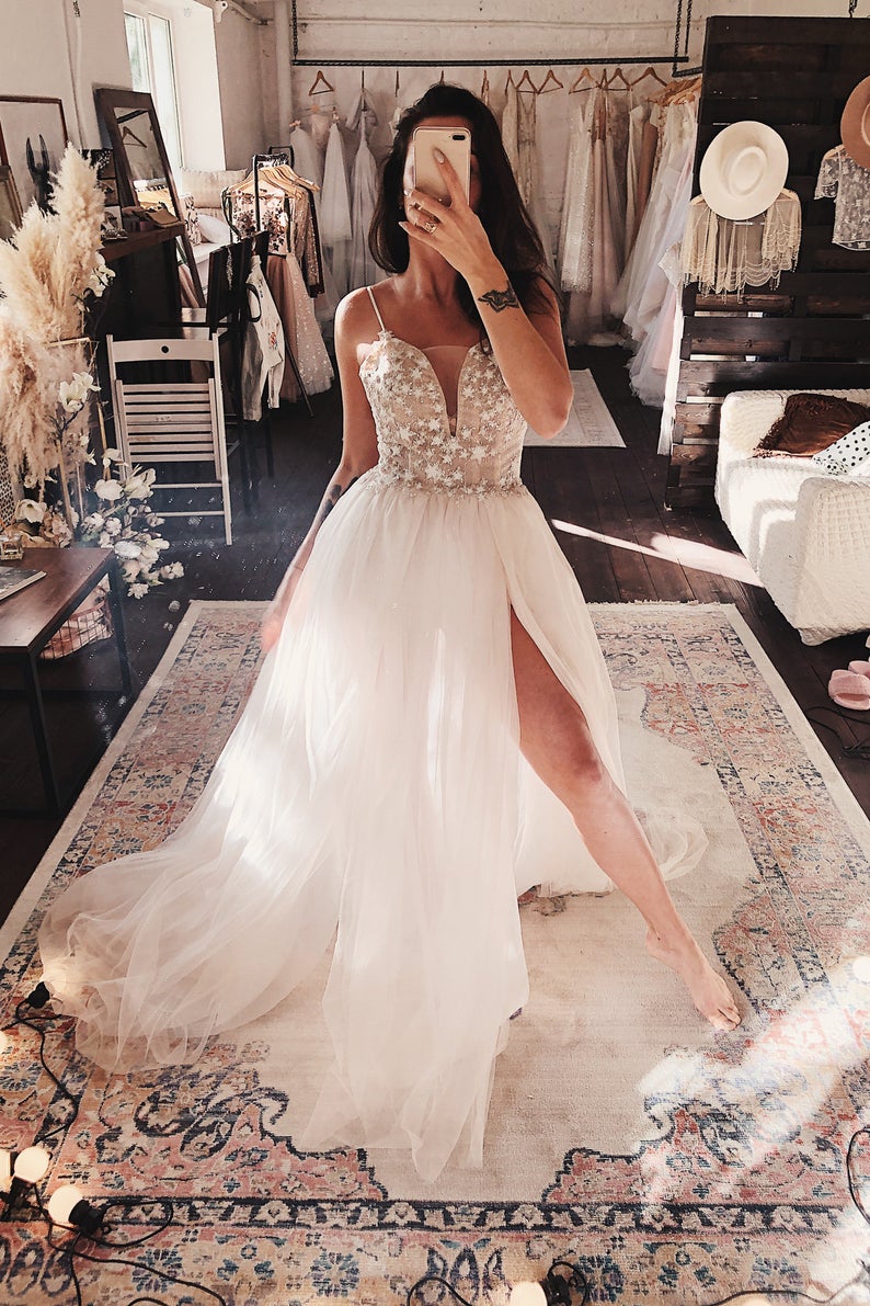 Exclusive Wedding Dress with Split Unique Sparkly Wedding Gown with Stars and Sequins