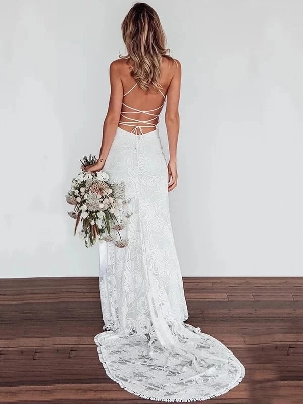 Sheath Cowl Neck Lace Wedding Dresses With Train