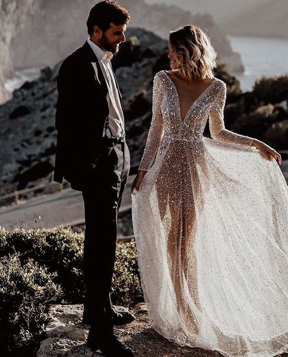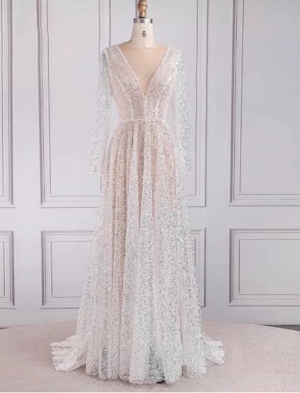 Sparking white See-Through Bing Bling Bridal Dress Long Sleeves Wedding Dresses