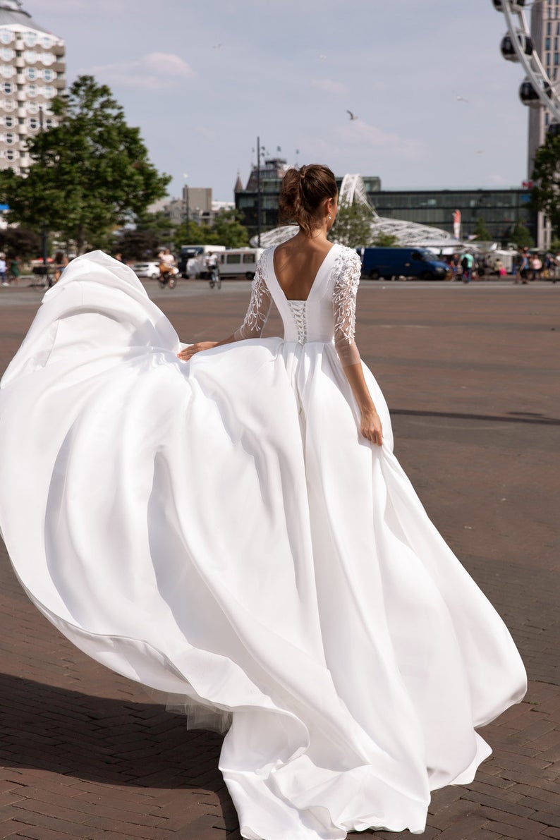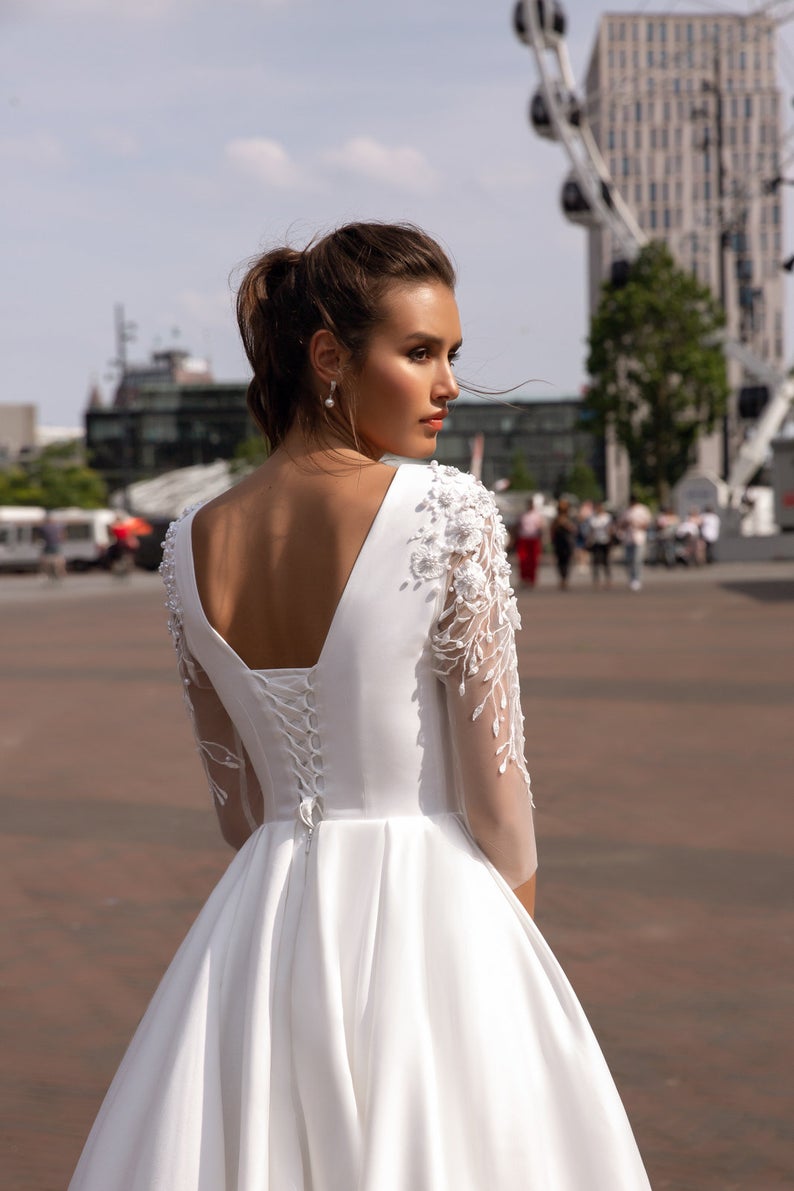 Ball Gown Boat Neck 3/4 Sleeves Satin Wedding Dresses with 3d Flowers Appliques