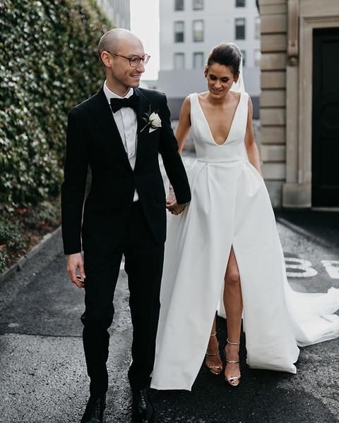 New Arrival A-Line Satin Wedding Dress, Sexy V-Neck Slit Backless Elegant Bridal Dress,