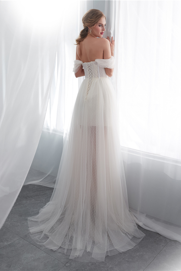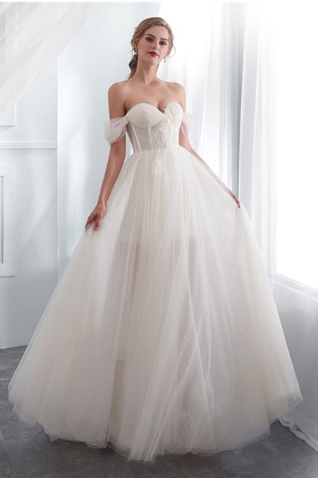 Princess A-Line Off the Shoulder Ivory Tulle Wedding Dresses with Appliques