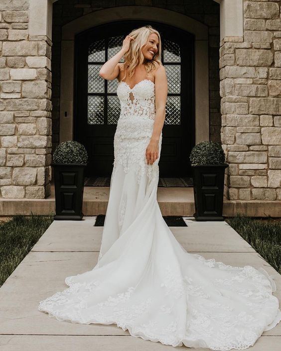Elegant Mermaid Sweetheart White Lace Wedding Dresses with Train