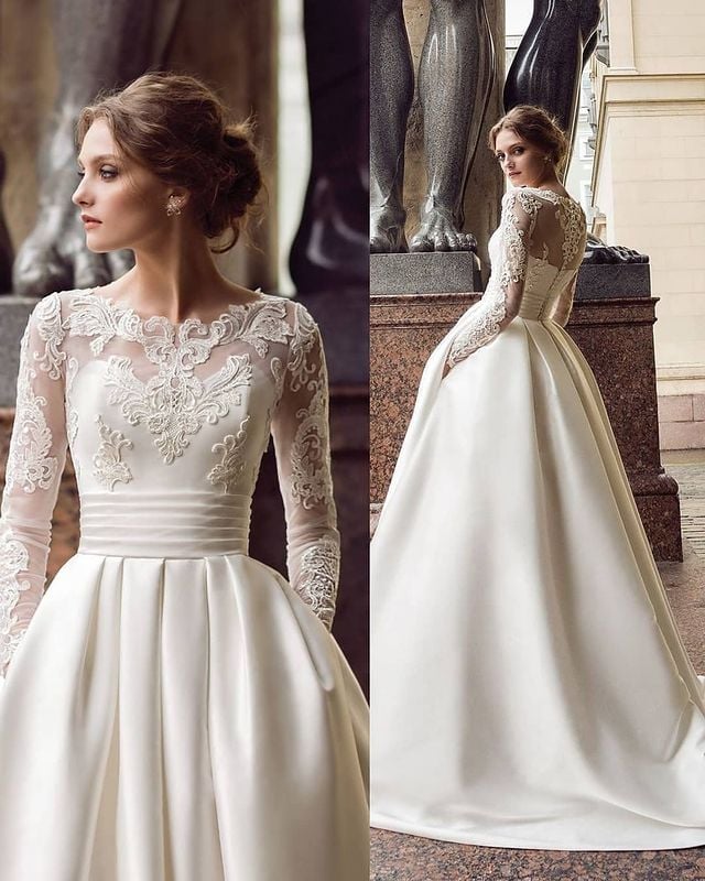 Gorgeous A-Line Long Sleeves Ivory Satin Wedding Dress with Appliques