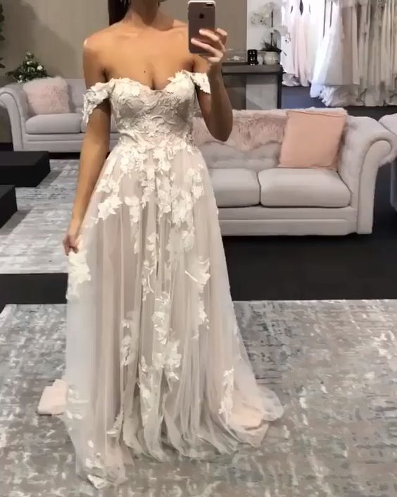 Boho A-Line Off the Shouder Tulle Lace Beach Wedding Dress
