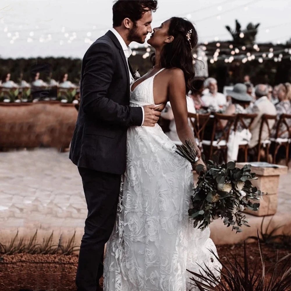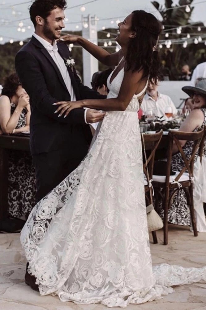 Boho A-Line Lace Wedding Dress with Slit Cross Back Bride Gown