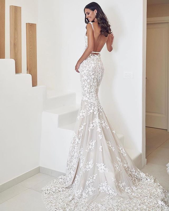 Mermaid V Neck Backless Lace Wedding Dresses with Train