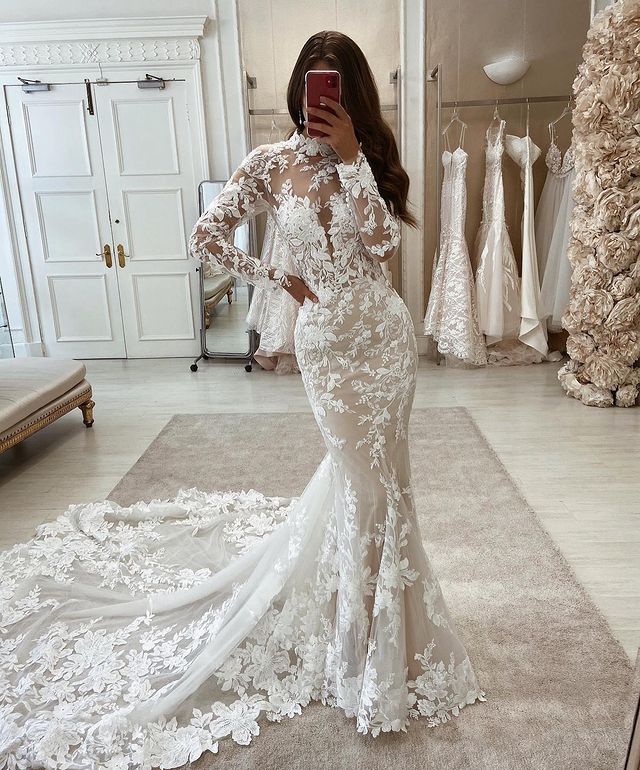 Gorgeous Mermaid High Neck Long Sleeve Lace Wedding Dresses
