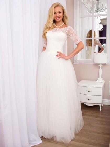 Chic A-Line Off the Shoulder Half Sleeve White Tulle Lace Wedding Dresses