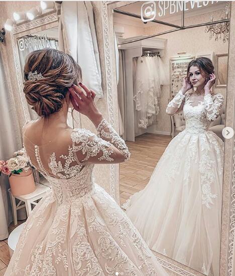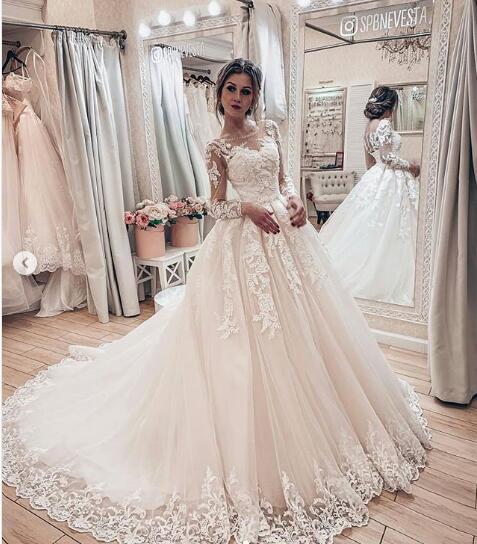 Ball Gown Long Sleeve Tulle Lace Appliques Wedding Dresses 2021