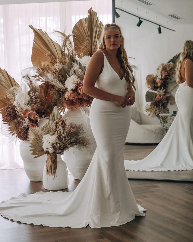 Simple Mermaid V Neck Open Back White Soft Satin Wedding Dresses