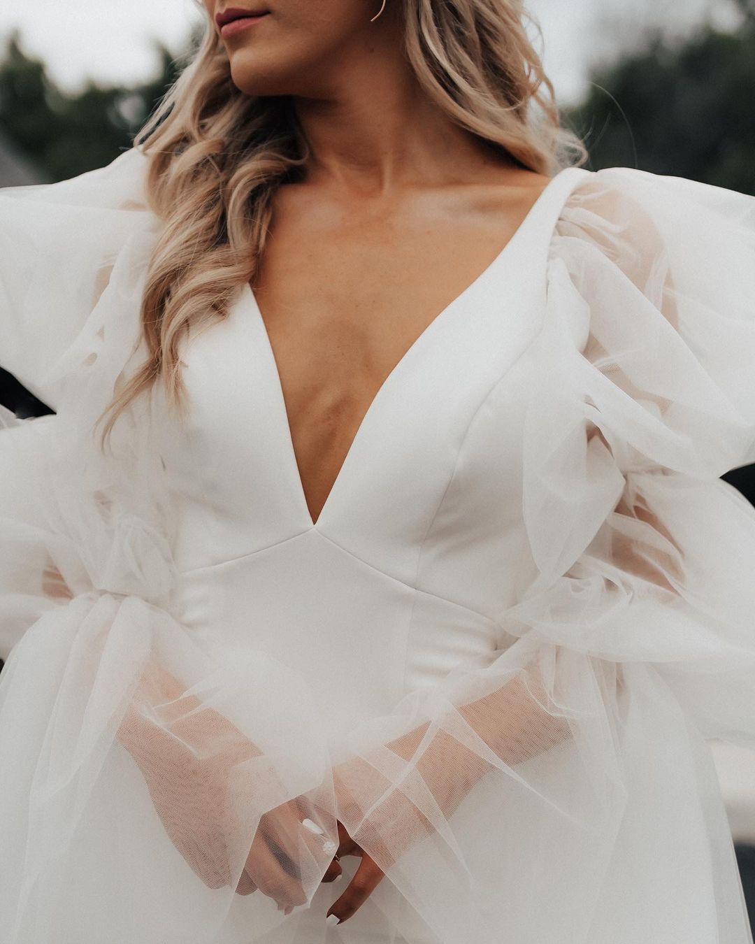 Cute Mermaid V Neck Long Wedding Dresses with Ruffled Sleeves