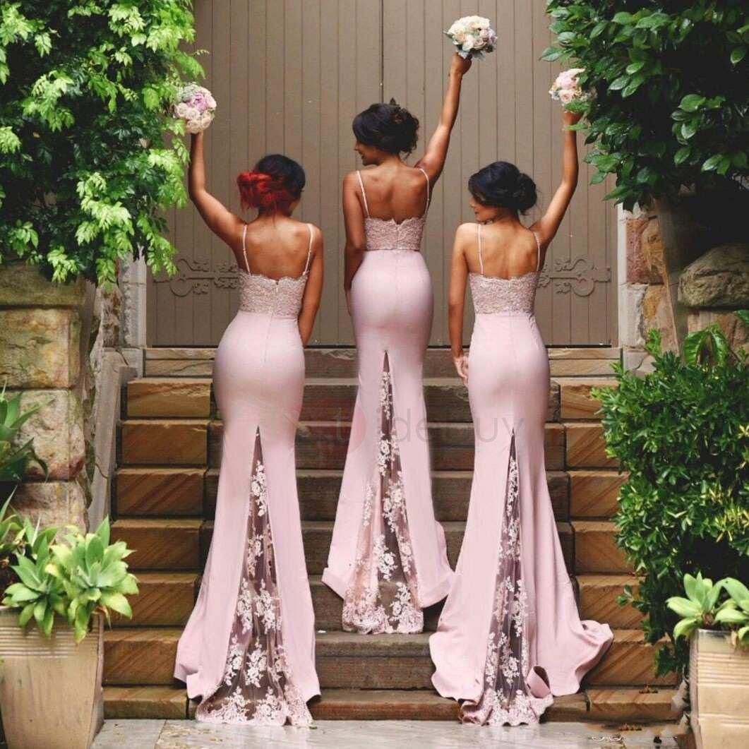 Bridesmaid Dress Mermaid Pink Spaghetti Straps Lace Satin Long Bridesmaid Dresses