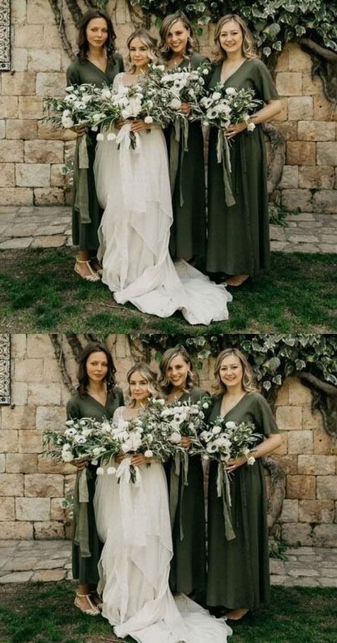 A-Line V Neck Hunter Green Ankle length Bridesmaid Dresses