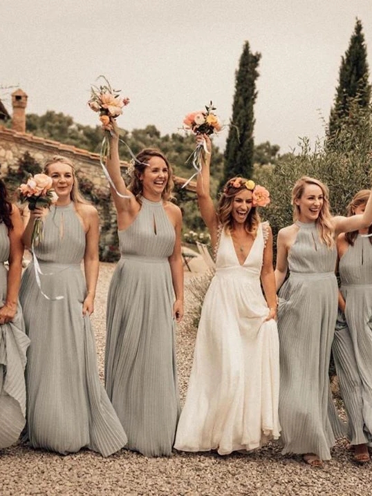 A-line Halter Pleated Sleeveless Bridesmaid Dresses Chiffon Long Gowns