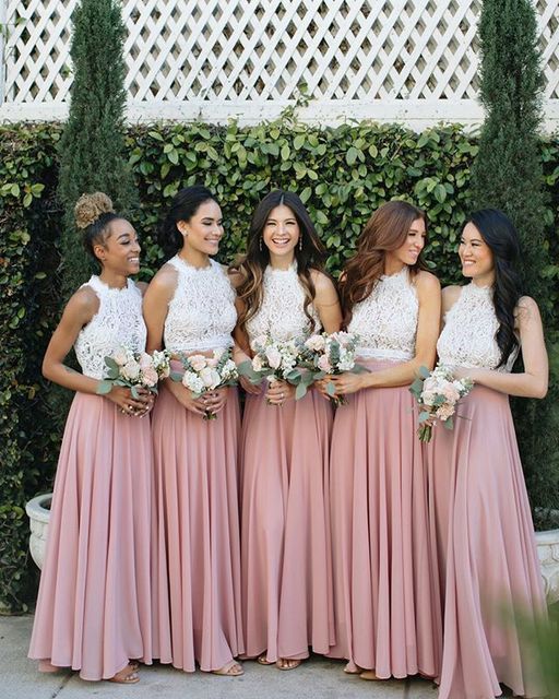 Pretty Two Piece Halter White and Pink Long Bridesmaid Dresses