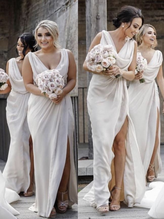 Sheath V Neck Ivory Chiffon Long Bridesmaid Dresses