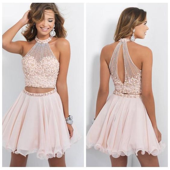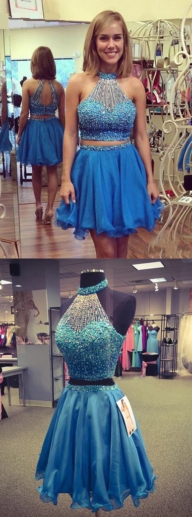 Two Piece Halter Beaded Short Prom Dresses,Homecoming Dresses