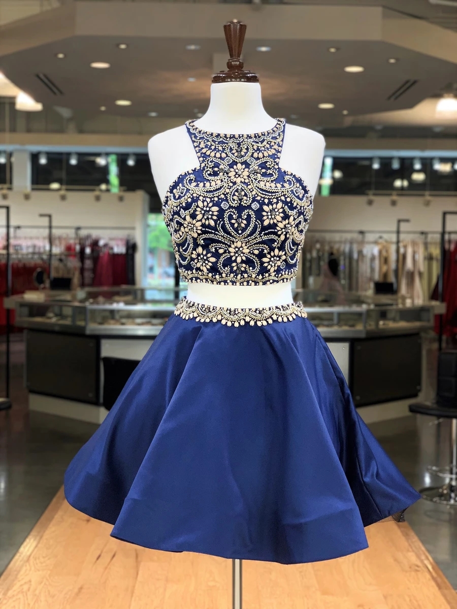 Pretty Two Piece Round Neck Beaded Royal Blue Satin Short Homecoming Dresses