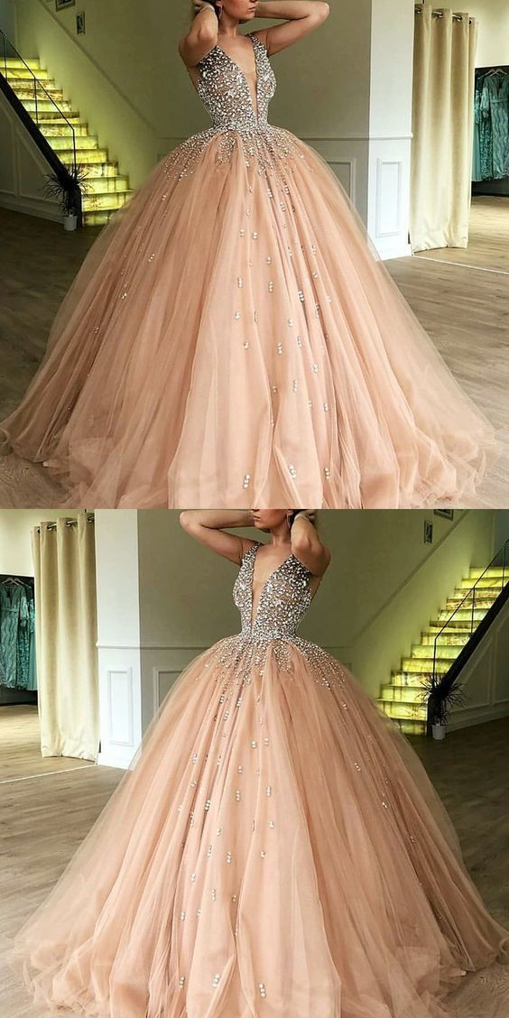 Ball Gown Deep V-Neck Sweep Train Light Champagne Tulle Prom Dress with Beading,Sweet 16 Party Dresses,Quinceanera Dresses