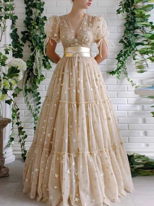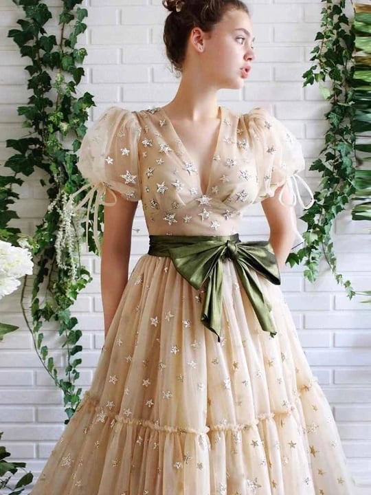 A Line V Neck Tulle Prom Dress Long Custom Evening Dress With Sleeve