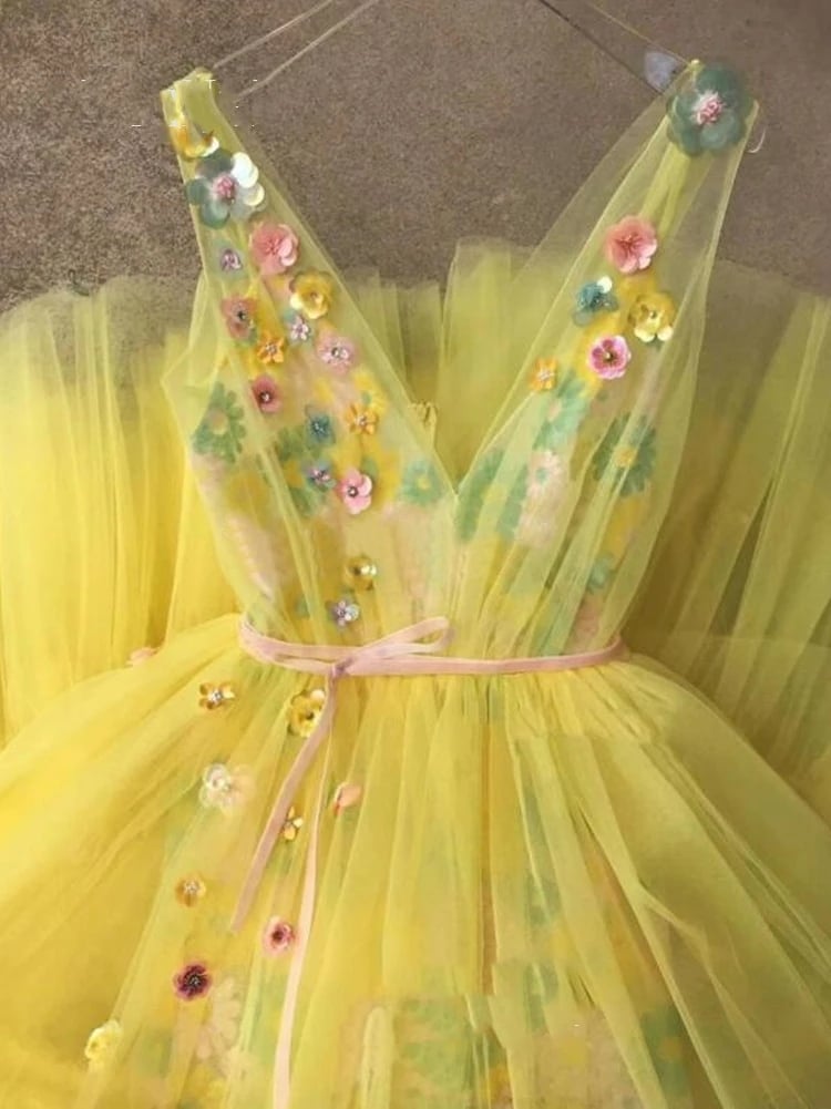 Yellow Tulle Prom Dress V Neck 3D Flower Vintage Evening Dress