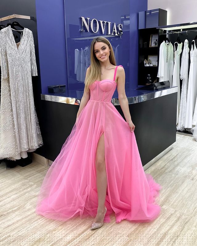 Charming A-Line Sweetheart Pink Tulle Long Prom Evening Dresses with Side Slit