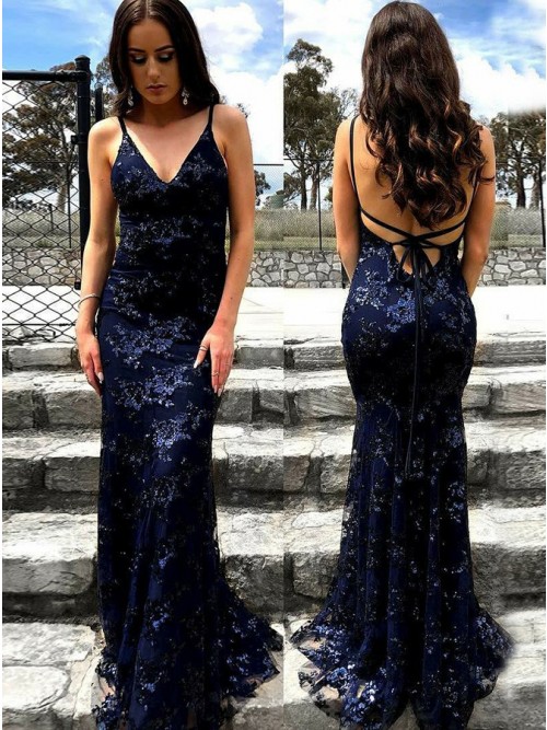 Glitter Mermaid Spaghetti Straps Backless Navy Blue Prom Dress,Formal Evening Party Dresses