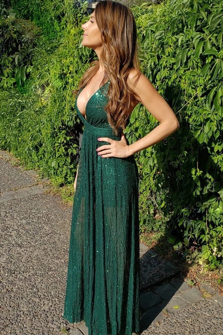 Sparkly A Line V Neck Floor Length Sequins Long Green Prom Dress Evening Dress