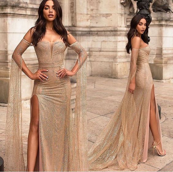 Sparkly Mermaid Sweetheart Long Sleeves Gold Sequin Long Prom Evening Dress with Split