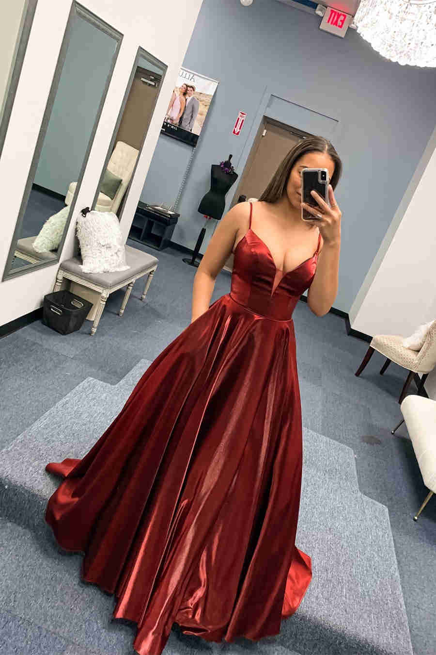 Elegant Spaghetti Straps Burgundy Satin Prom Dresses