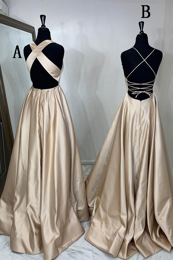 2 Styles Champagne Satin Long Prom Dresses