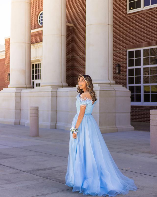 Princess A-Line Off the Shoulder Blue Tulle Long Prom Dresses with Slit