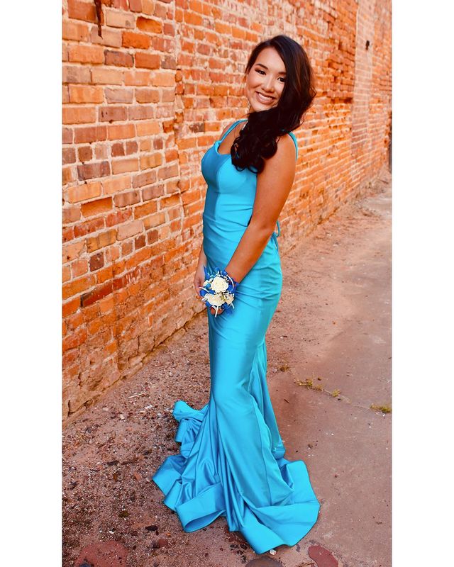 Charming Mermaid Scoop Neck Lake Blue Satin Long Prom Dresses