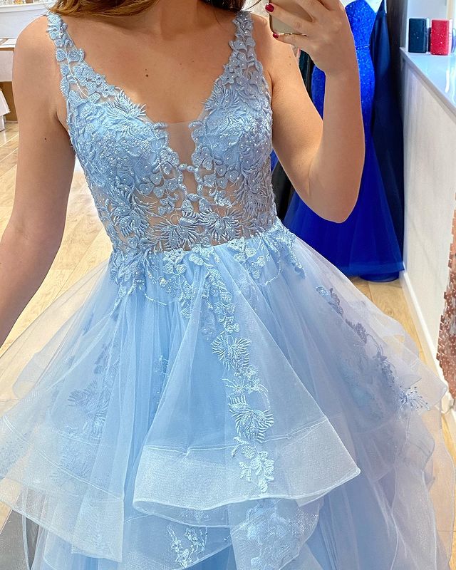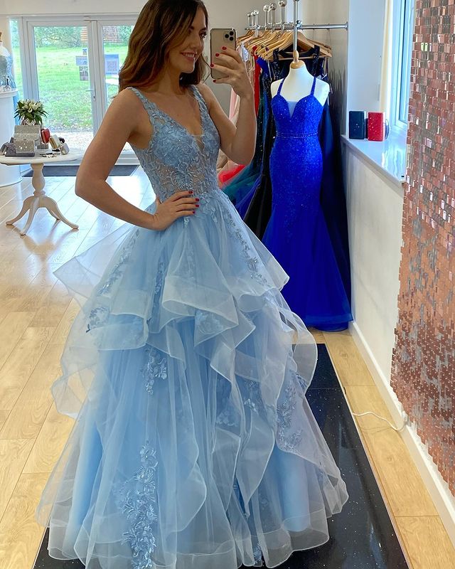 Princess A-Line V Neck Blue Tulle Long Prom Dresses with Appliques