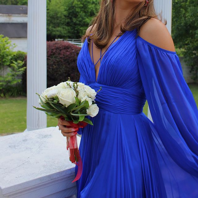 Chic A-Line Royal Blue Chiffon Long Sleeve Evening Party Dresses Prom Dresses