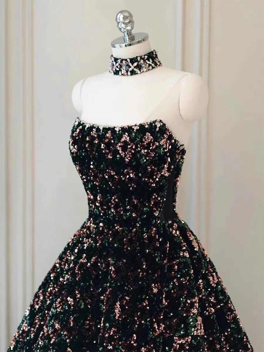 Sparkly Ball Gwon Dark Green Velvet Sequins Prom Dresses