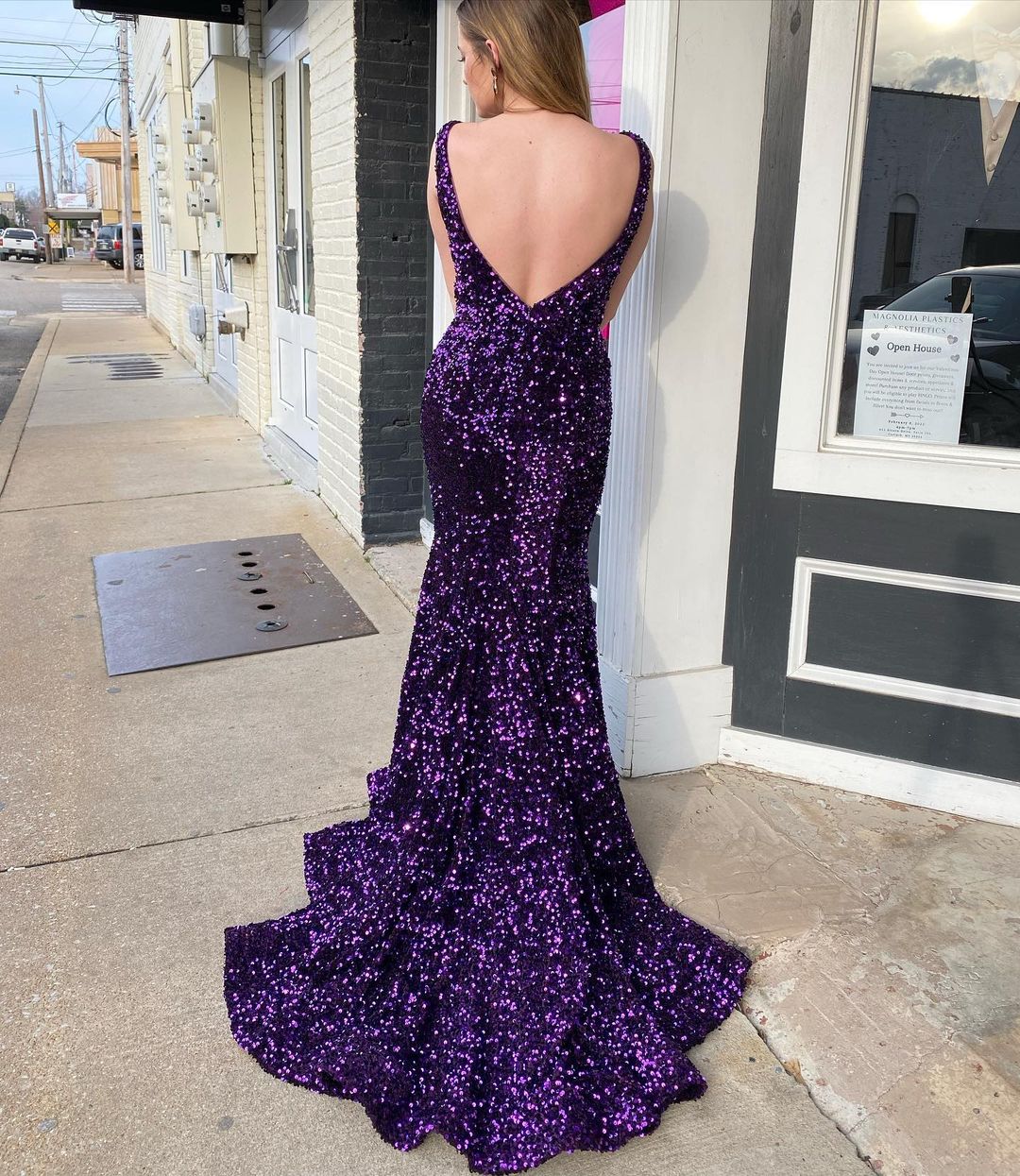 Glitter Mermaid V Neck Open Back Grape Sequins Long Prom Dresses